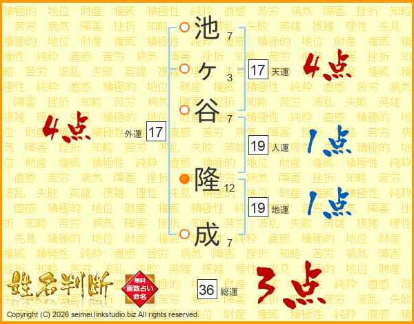池(7画)ヶ(3画)谷(7画) 隆(12画)成(7画)
