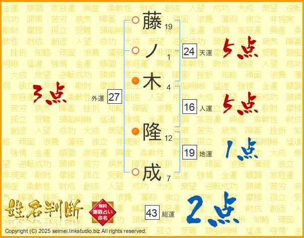 藤(19画)ノ(1画)木(4画) 隆(12画)成(7画)