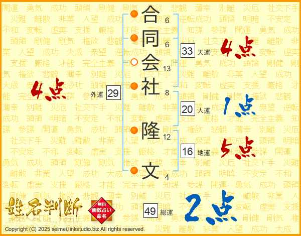 合(6画)同(6画)会(13画)社(8画) 隆(12画)文(4画)