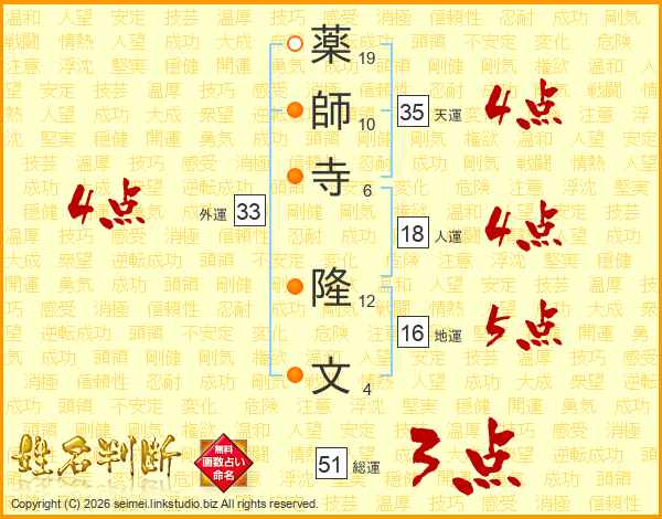 薬師寺隆文さんの外運は33画の4点!