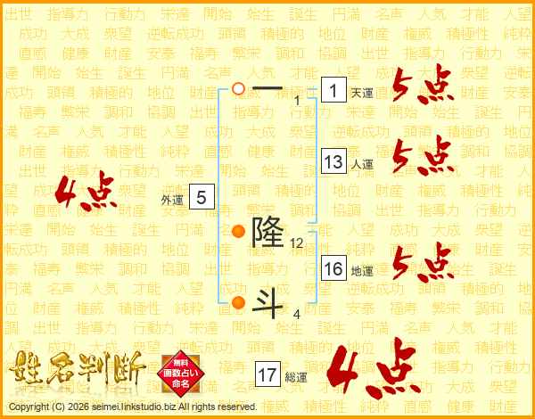 あなたの人生を表す1番重要な運勢です。生涯を通じて影響する総合運となり、主に50歳以降の晩年期に影響を及ぼします。苗字と名前の合計画数。