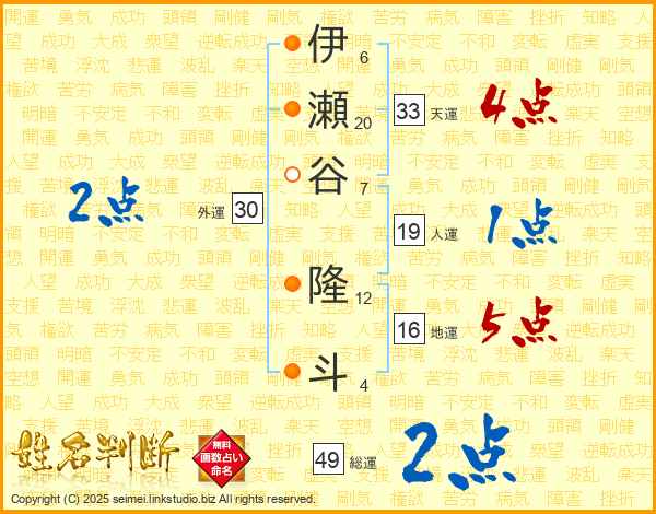 伊瀬谷隆斗さんの総運は49画の2点!