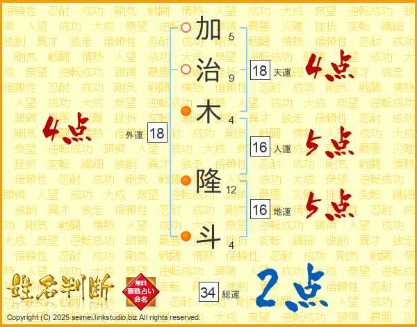 加(5画)治(9画)木(4画) 隆(12画)斗(4画)