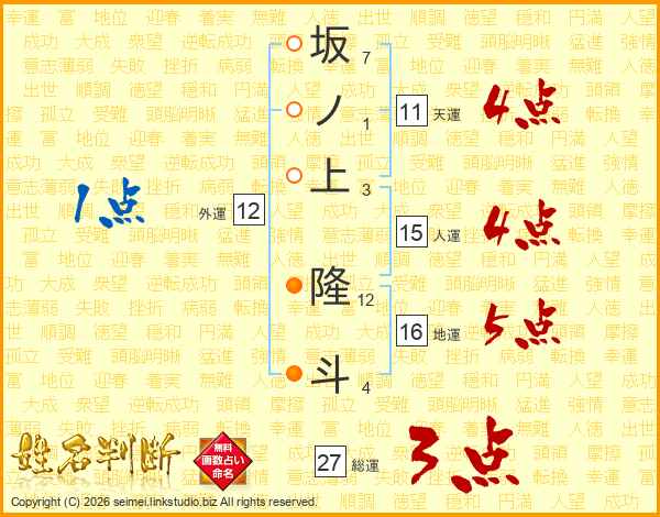 坂ノ上隆斗さんの総運は27画の3点!