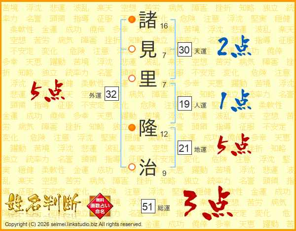 諸(16画)見(7画)里(7画) 隆(12画)治(9画)