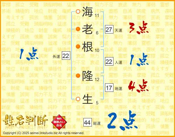 海(11画)老(6画)根(10画) 隆(12画)生(5画)