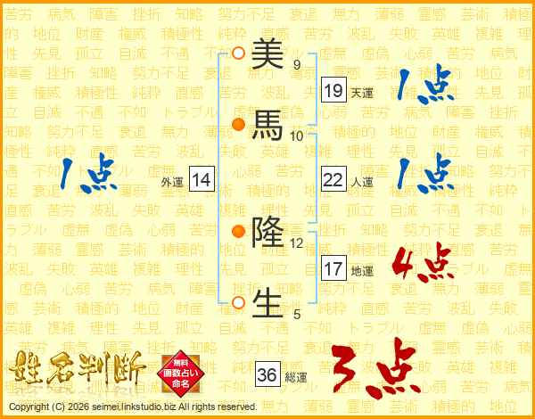 生活面を象徴する運勢です。外部から受ける影響力を表し、結婚運、家庭運や職場、環境への順応性を表します。総運から人運を引いた画数。姓や名が1文字の場合を除く。