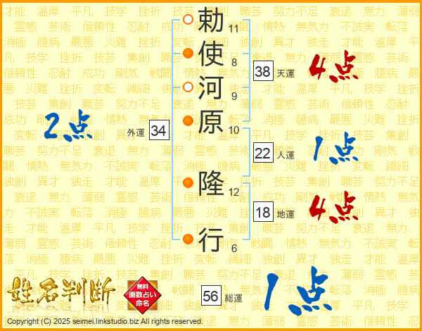 勅(11画)使(8画)河(9画)原(10画) 隆(12画)行(6画)