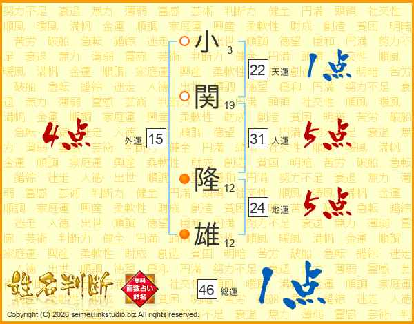 小(3画)関(19画) 隆(12画)雄(12画)