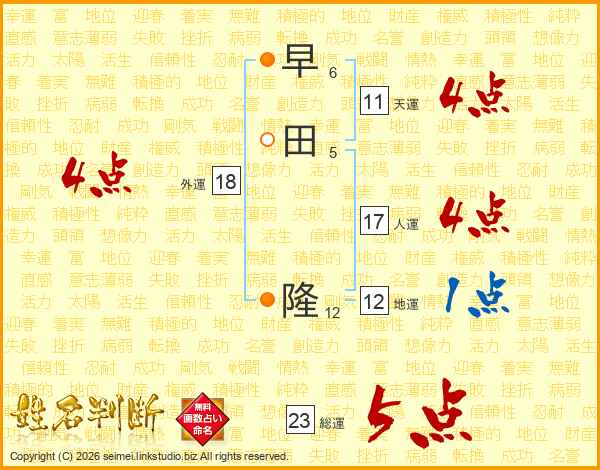 あなたの人生を表す1番重要な運勢です。生涯を通じて影響する総合運となり、主に50歳以降の晩年期に影響を及ぼします。苗字と名前の合計画数。