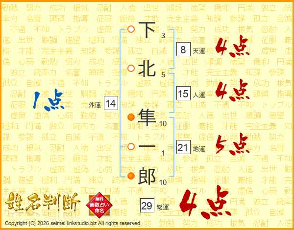 下(3画)北(5画) 隼(10画)一(1画)郎(10画)