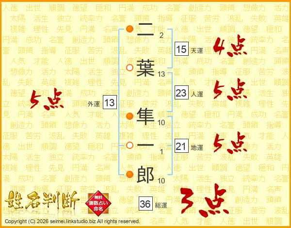 二(2画)葉(13画) 隼(10画)一(1画)郎(10画)