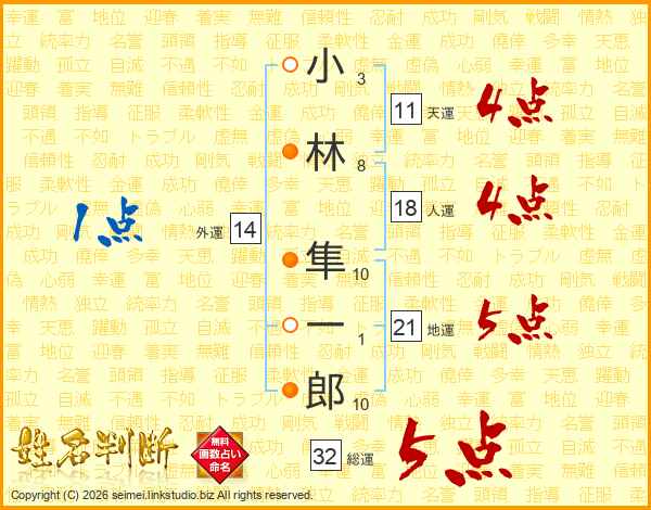 小(3画)林(8画) 隼(10画)一(1画)郎(10画)