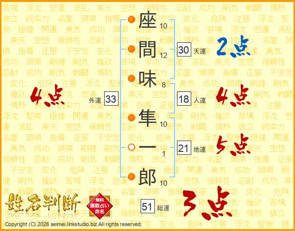 座(10画)間(12画)味(8画) 隼(10画)一(1画)郎(10画)