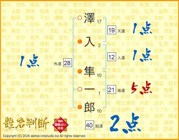 澤(17画)入(2画) 隼(10画)一(1画)郎(10画)