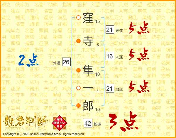 窪(15画)寺(6画) 隼(10画)一(1画)郎(10画)