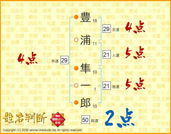 豊(18画)浦(11画) 隼(10画)一(1画)郎(10画)