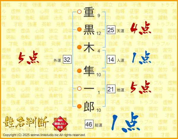 あなたの人生を表す1番重要な運勢です。生涯を通じて影響する総合運となり、主に50歳以降の晩年期に影響を及ぼします。苗字と名前の合計画数。