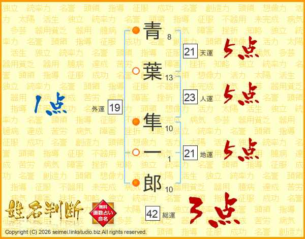 青(8画)葉(13画) 隼(10画)一(1画)郎(10画)