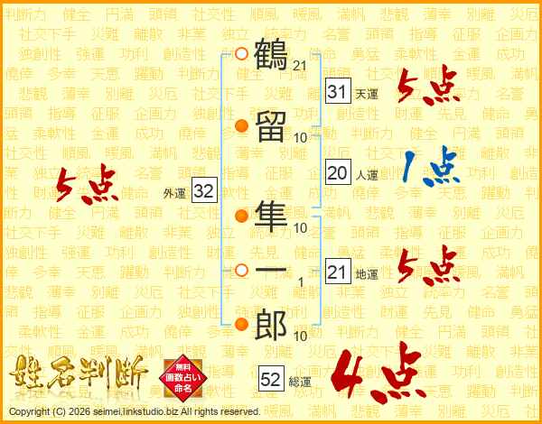 鶴(21画)留(10画) 隼(10画)一(1画)郎(10画)