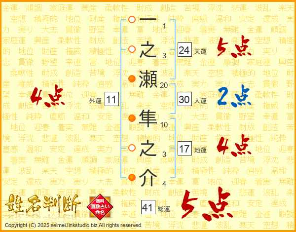 一之瀬隼之介さんの総運は41画の5点!