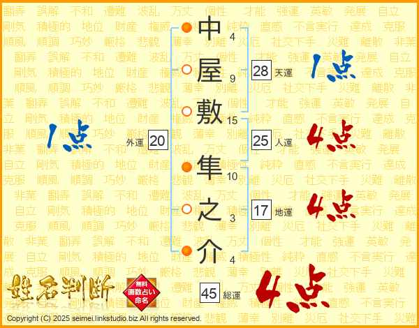 中(4画)屋(9画)敷(15画) 隼(10画)之(3画)介(4画)