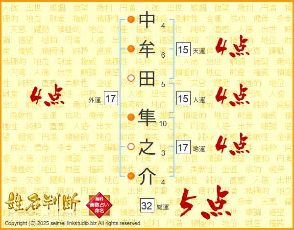 中(4画)牟(6画)田(5画) 隼(10画)之(3画)介(4画)
