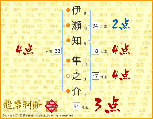 伊(6画)瀬(20画)知(8画) 隼(10画)之(3画)介(4画)