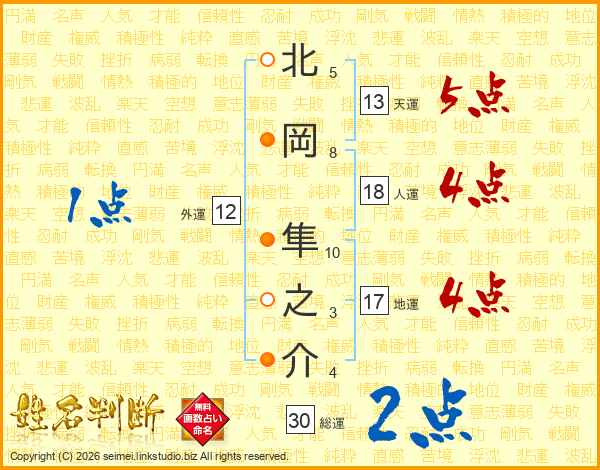 北(5画)岡(8画) 隼(10画)之(3画)介(4画)