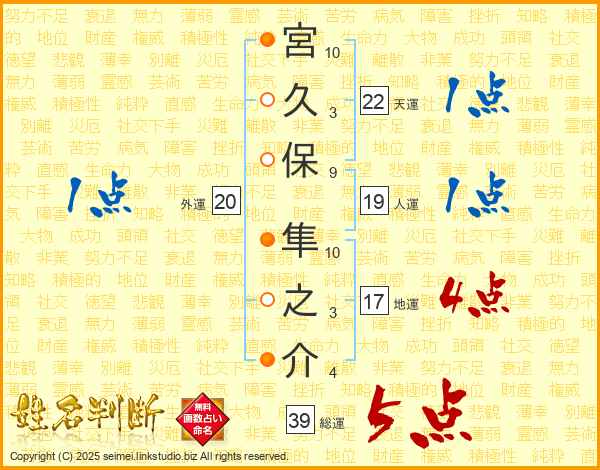 宮(10画)久(3画)保(9画) 隼(10画)之(3画)介(4画)
