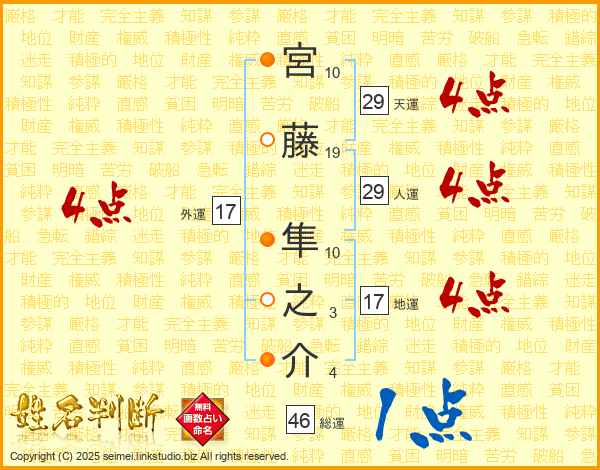 宮(10画)藤(19画) 隼(10画)之(3画)介(4画)