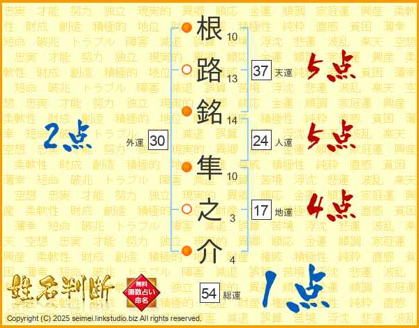 根(10画)路(13画)銘(14画) 隼(10画)之(3画)介(4画)