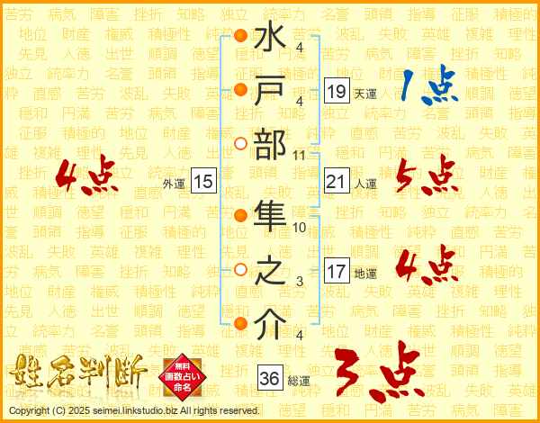 水(4画)戸(4画)部(11画) 隼(10画)之(3画)介(4画)