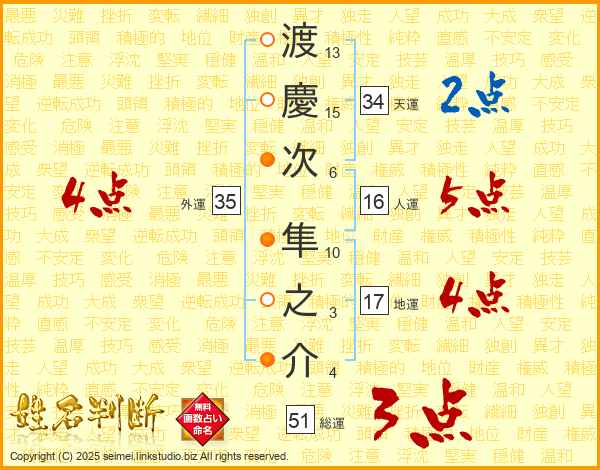渡(13画)慶(15画)次(6画) 隼(10画)之(3画)介(4画)