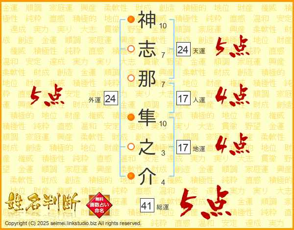 神(10画)志(7画)那(7画) 隼(10画)之(3画)介(4画)