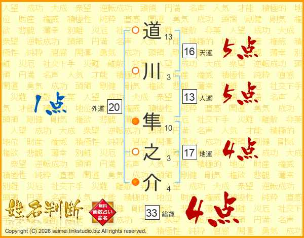 道川隼之介さんの総運は33画の4点!