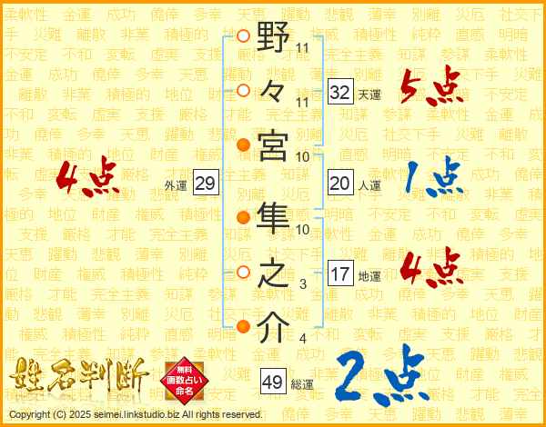 野(11画)々(11画)宮(10画) 隼(10画)之(3画)介(4画)