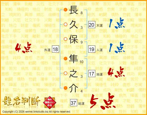 長(8画)久(3画)保(9画) 隼(10画)之(3画)介(4画)