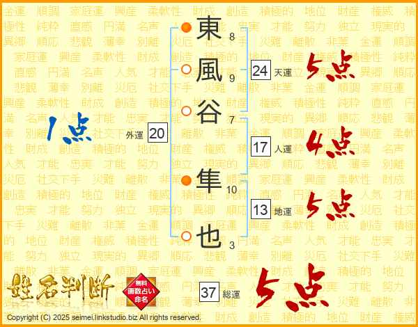 東(8画)風(9画)谷(7画) 隼(10画)也(3画)