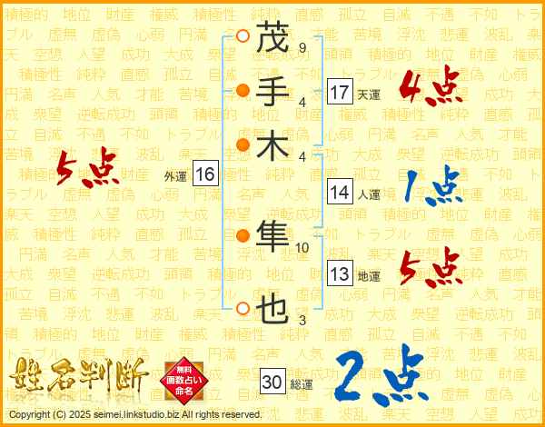 茂(9画)手(4画)木(4画) 隼(10画)也(3画)