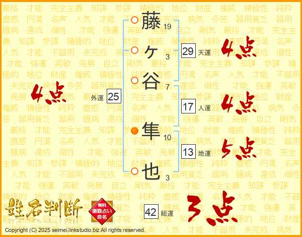 藤(19画)ヶ(3画)谷(7画) 隼(10画)也(3画)