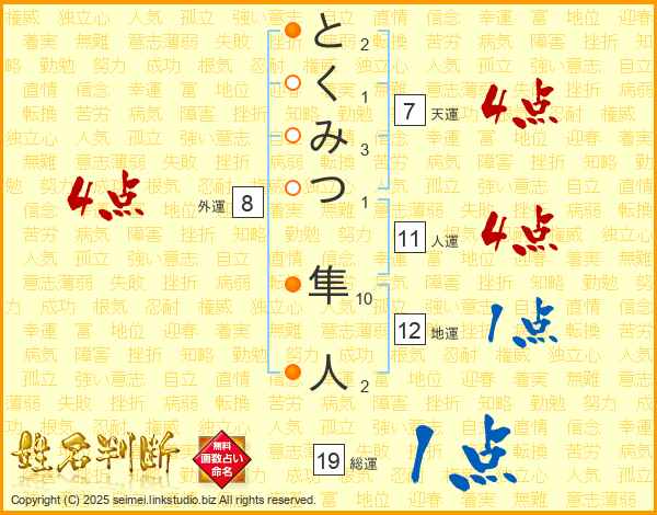 生活面を象徴する運勢です。外部から受ける影響力を表し、結婚運、家庭運や職場、環境への順応性を表します。総運から人運を引いた画数。姓や名が1文字の場合を除く。