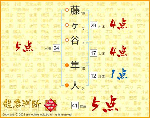 藤(19画)ヶ(3画)谷(7画) 隼(10画)人(2画)