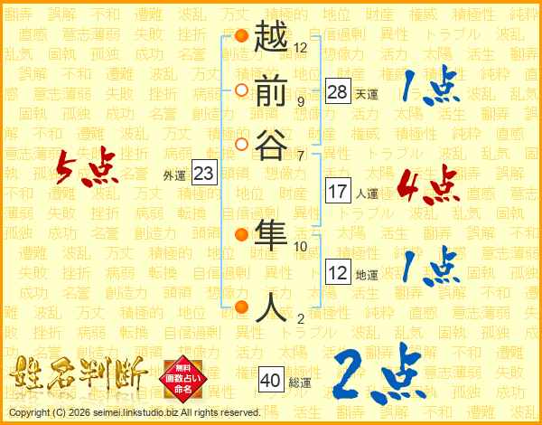 生活面を象徴する運勢です。外部から受ける影響力を表し、結婚運、家庭運や職場、環境への順応性を表します。総運から人運を引いた画数。姓や名が1文字の場合を除く。