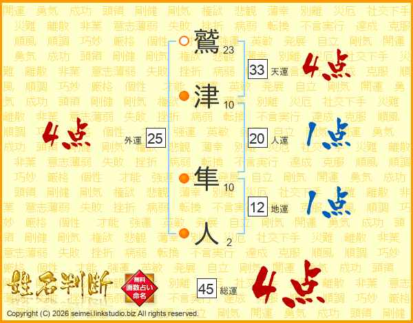 鷲(23画)津(10画) 隼(10画)人(2画)
