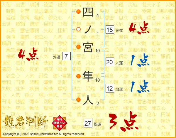 四ノ宮隼人さんの総運は27画の3点!
