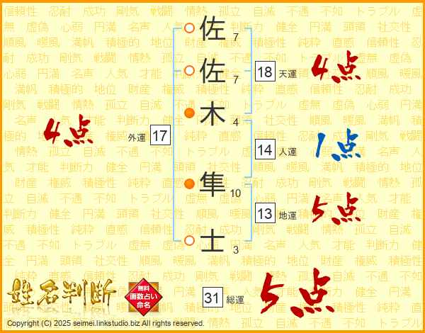 佐佐木隼士さんの総運は31画の5点!