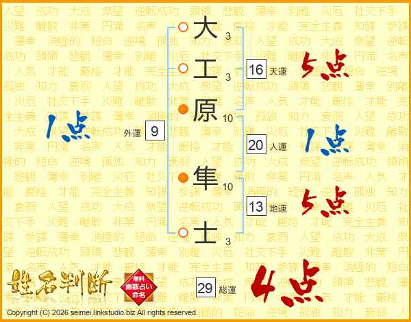 あなたの人生を表す1番重要な運勢です。生涯を通じて影響する総合運となり、主に50歳以降の晩年期に影響を及ぼします。苗字と名前の合計画数。