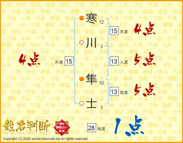 寒川隼士さんの総運は28画の1点!