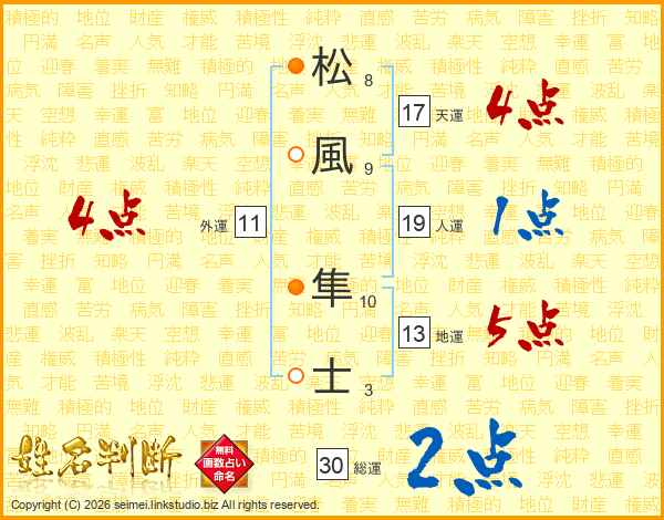 あなたの人生を表す1番重要な運勢です。生涯を通じて影響する総合運となり、主に50歳以降の晩年期に影響を及ぼします。苗字と名前の合計画数。